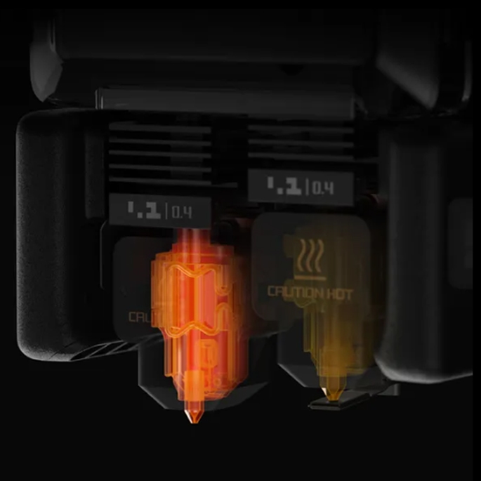 H2D دارای سیستم خاص Hotend با دو نازل است؛ یکی متحرک و قابل بالا رفتن و دیگری ثابت. این امکان را می دهد که هم زمان با دو رنگ یا دو نوع متریال کار کنی، ضایعات متریال کاهش یابد و کنترل فرایند چاپ دقیق تر شود.