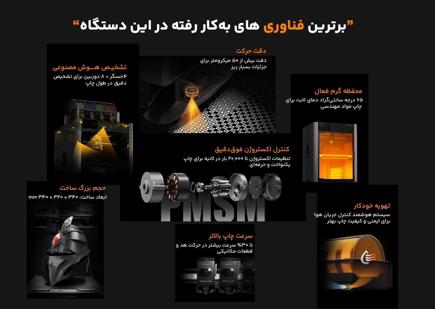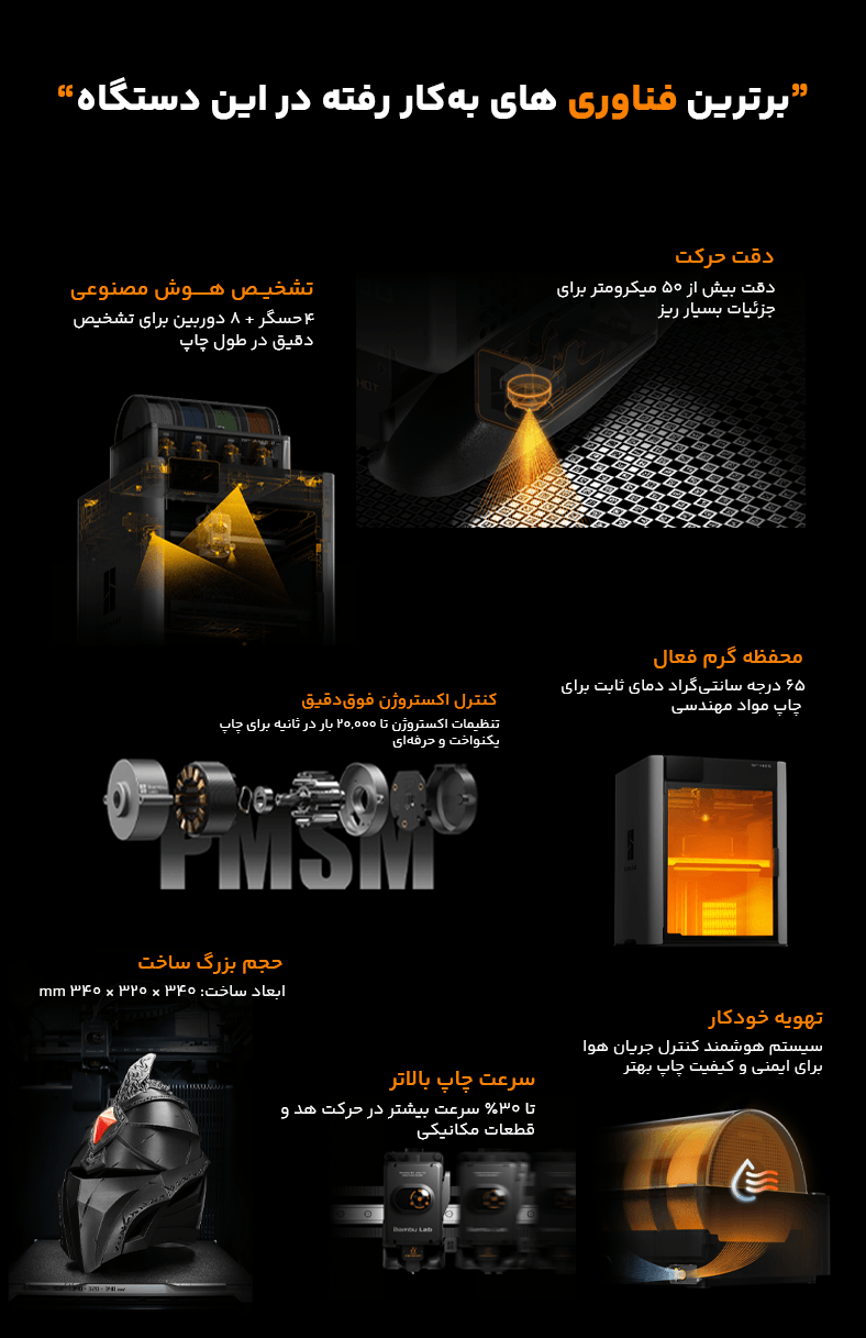 این یعنی چاپ ABS، ASA، PC، PA، نایلون و فیلامنتهای تقویتشده بدون تاببرداشتگی و مشکلات متداول.